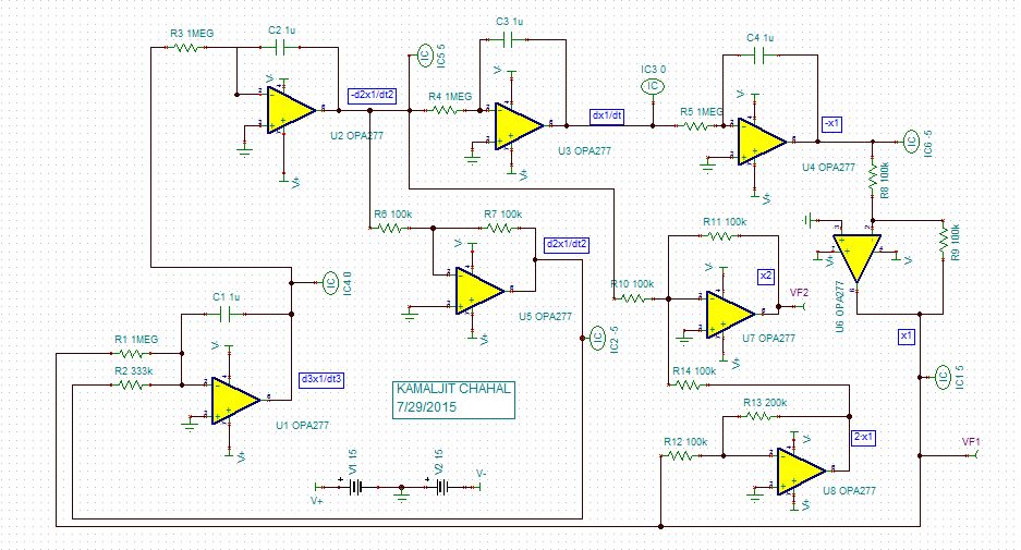 The above header image is that of the circuit created in the circuit simulator TI-TINA. OP277 op amps are used because they are more precise than LM741s. The circuit simulates a free-hanging 2-mass 2-spring system.